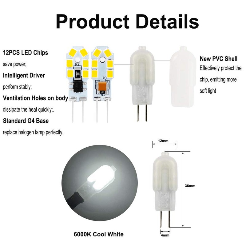 - Quick and easy installation: standard G4 bi-pin base, perfect replacement for all traditional G4 halogen bulbs.