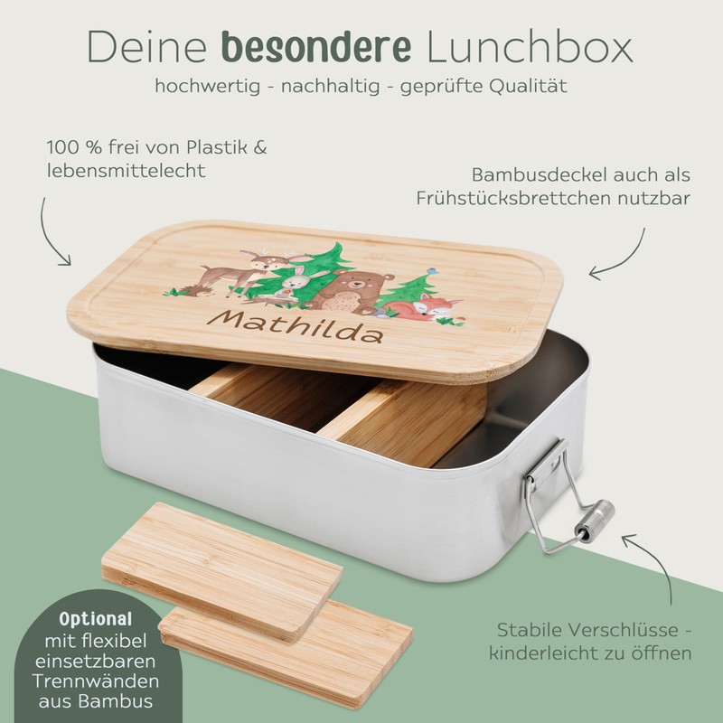 - Robust and stable – so that you can enjoy your lunch box with divider for a long time, our lunch box combines stainless steel and bamboo. Both materials are characterised by their resilience.