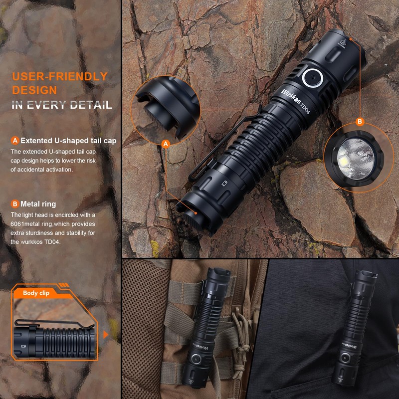 • IPX68 waterproof: Wurkkos TD04 LED torch is made of 6061 aviation aluminium alloy. Adopting orange peel light cup process with flood and spot light modes. 11° spot light angle inherits the advantages of tactical torches. 68° flood light angle can meet your daily needs.