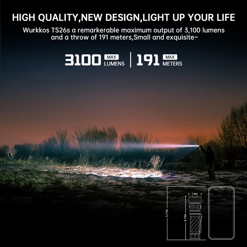 - ♛♛【Bright and Stable Output】: Wurkkos TS26S Flashlight uses a ‘Boost Driver’ to raise the battery voltage to the voltage needed for a four emitter array, it's output is very bright and stable,will not lose too quickly. The flood-type beam its projected can illuminate the entire area in front of you with a maximum throw distance of 191 metres.