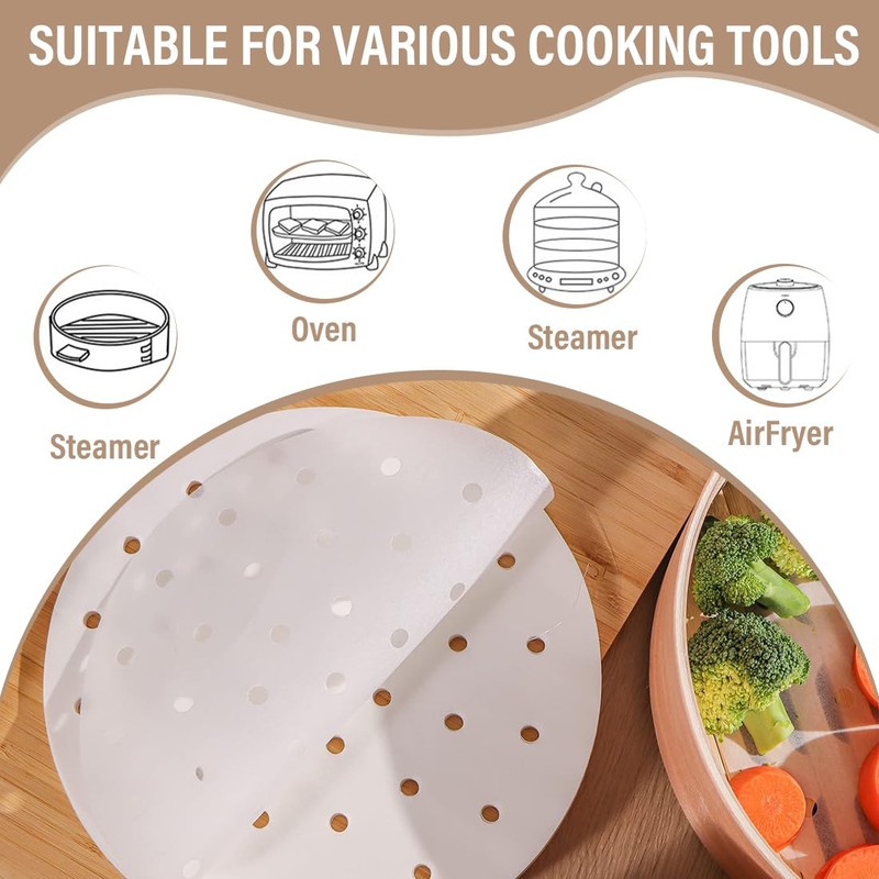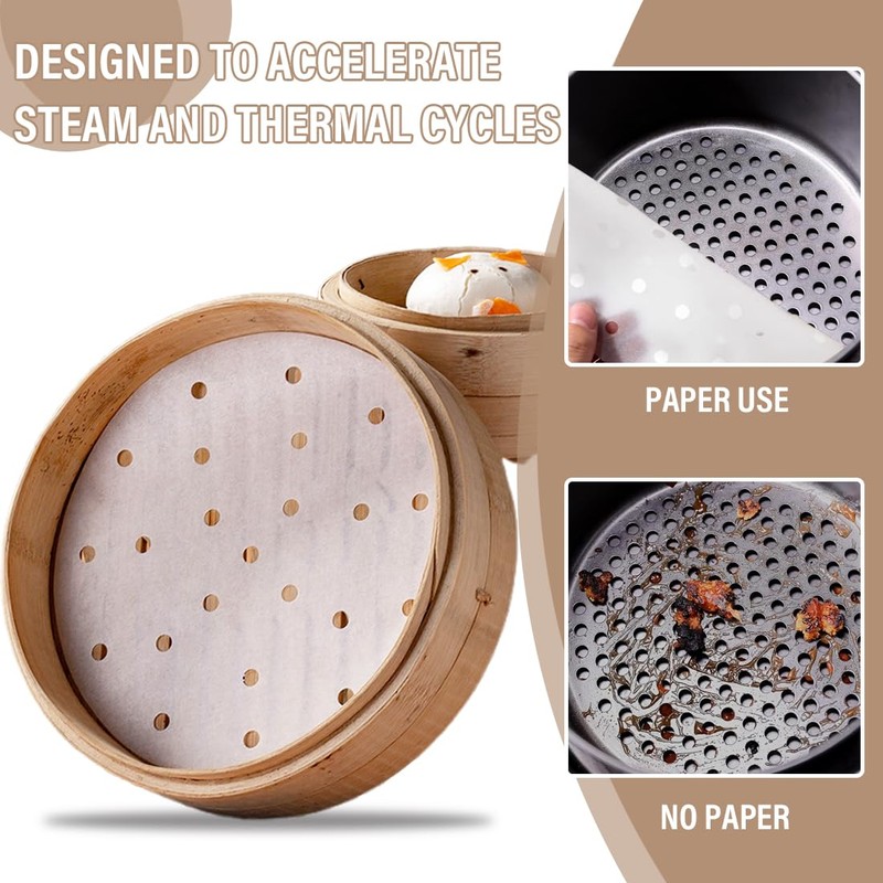WUSJCOF Pack of 100 Dim Sum Paper, Non-Stick Coating, as a Base for Bamboo Steamer, Hot Air Fryer, Steamer, Air Fryer Liner, Round Baking Paper, Perforated Bamboo Paper (Diameter 20 cm)