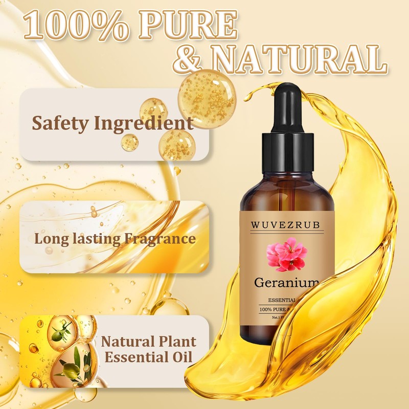 - Geranium Essential Oils: Steam-distilled pure oil in a sleek bottle (additive-free) with precision dropper for deep aroma