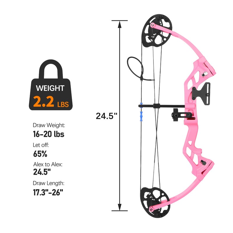 - BOW SPECIFICATIONS: 24.5" axle-to-axle; 16-20 lbs draw weight; 17.3"-26" draw length; 65% let-off; bow weight is 2.2 lbs, lightweight design. Meanwhile, WUXLISTY compound bow is a great gift for your family and friends.