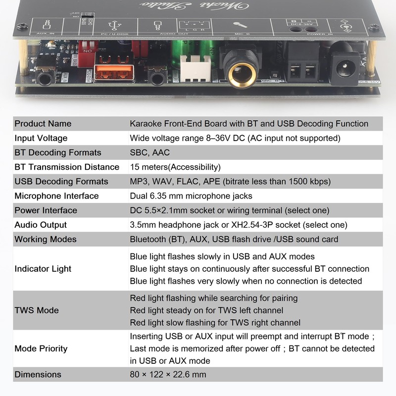 - Wide Voltage Input & Bluetooth 5.0 Supports 8-36V DC (no AC input) and features the Bluetooth 5.0 chip (Mountain View BP1048B2) with SBC/AAC decoding, ensuring stable connectivity up to 15 meters.