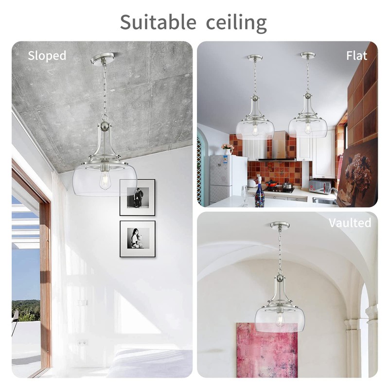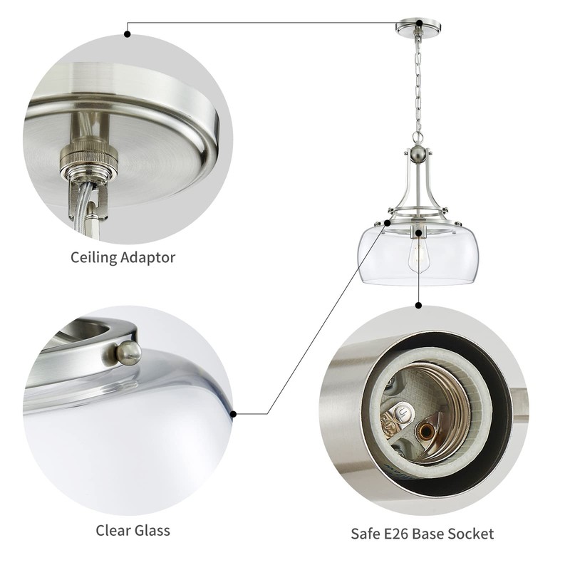 - Design: This rustic farmhouse Wuzups pendant chandelier light offers a modern interpretation of a classic urban-industrial style, which adds a vintage flair to your space. It comes in a brushed nickel finish and features a prominent round clear glass shade. The mouth-blown glass has a few pinprick bubbles that add to the vintage look and feel. As an added bonus, this pendant light comes with an energy-efficient LED light bulb in a classic Edison style that's sure to add a nostalgic glow.