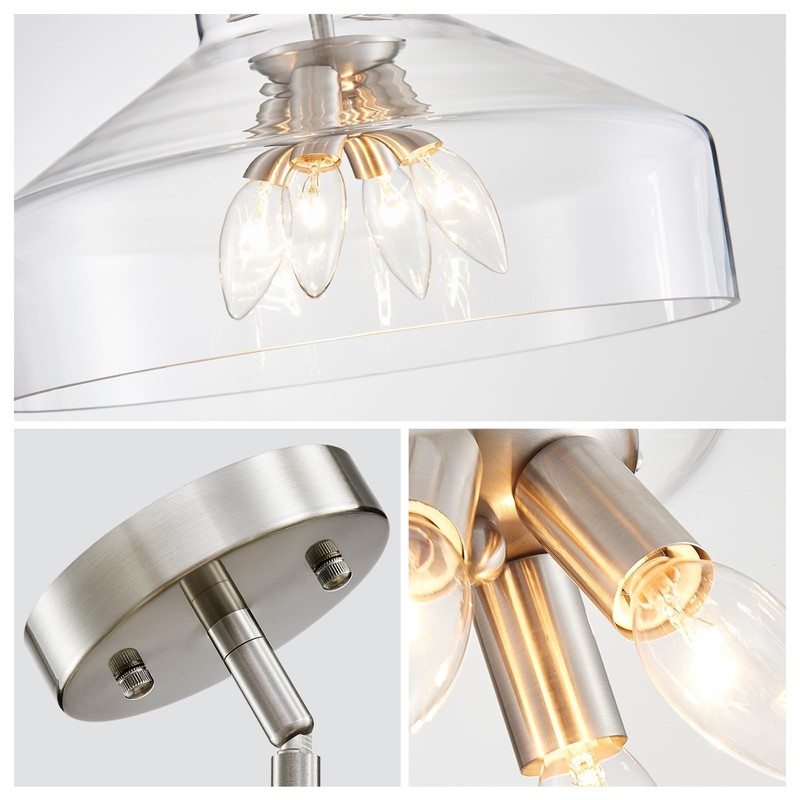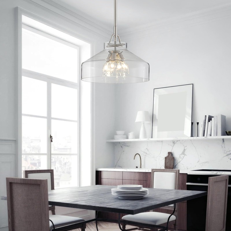 - Design: This rustic farmhouse Wuzups pendant chandelier light with design offers a modern interpretation of a classic urban-industrial style, which adds a vintage flair to your space. It comes in a gold finish and features a prominent round clear glass shade. The mouth-blown glass has a few pinprick bubbles that add to the vintage look and feel.