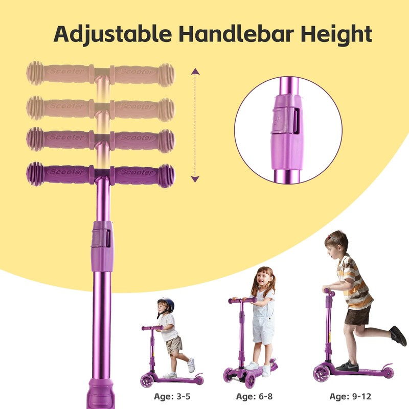 - Adjustable scooter: Our Kid scooter design with 4 adjustable height options to accommodate ages 3 to 13 years old. Kids can hold the handles of the scooter comfortably.
