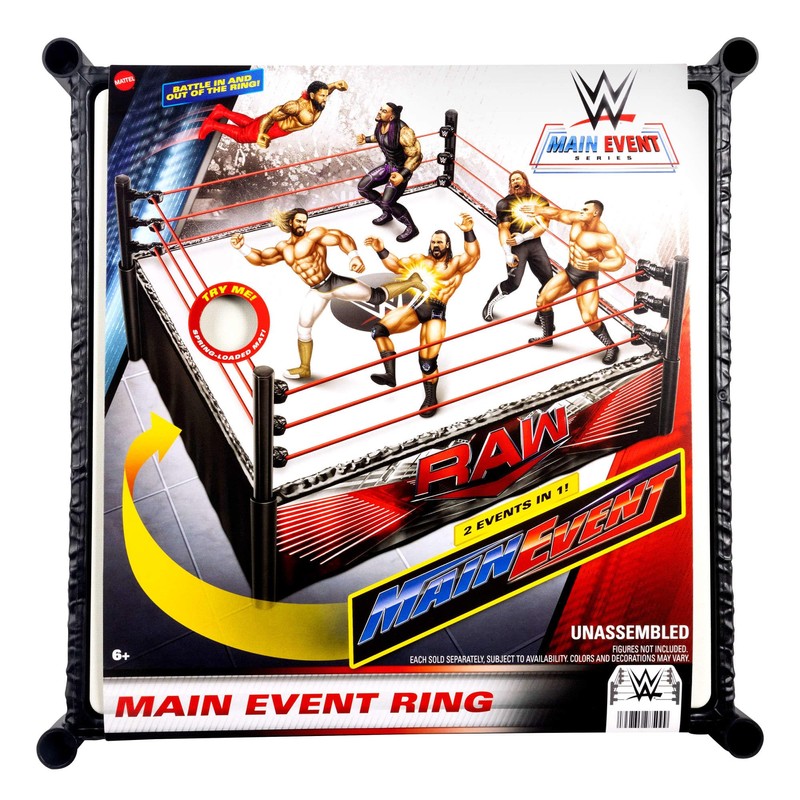 Wwe excitement comes home with this wwe superstar ring playset that includes ring labels for the wwe main event and raw fans can recreate their favorite televised events or make up their own matches. Pose figures (sold separately, subject to availability) on the foot pegs, bounce 'em off the pro tension ring ropes, pin 'em to the spring-loaded ring mat or get back up and keep on brawlin' kids and fans will love the set for its play and display. Colors and decorations may vary.
