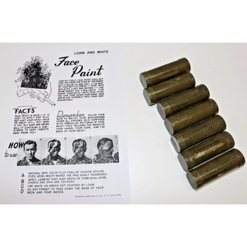 Original Vintage US Military issue camouflage face paint stick. White and loam US Army spec 39-12. Stock number 29-P 850 Mfg by Pond's Extract Company in Clinton Conn. USA. a copy of The original instruction poster comes with each stick. 1945 poster for the face paint stick.  Stick measures 3 inches long x 1 inch diameter. Weight per stick is 2.2oz. each stick is half white and half loam. The label on all the sticks is clear and mostly legible. May have some scratches or scrapes from storage.  To prevent damage, we will fold the sheet in half and ship in a bubble mailer.