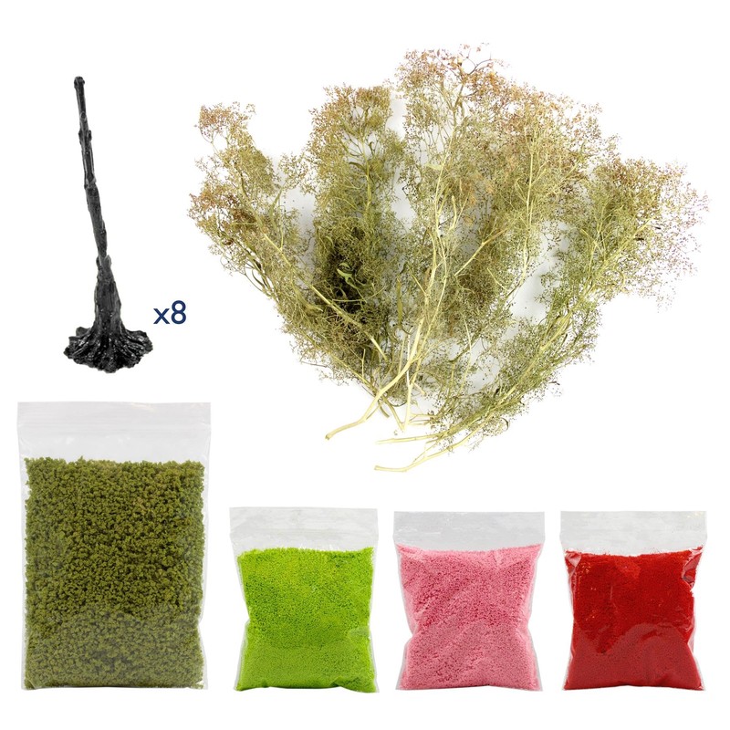 Kit Contains: 8x Brown Plastic Tree (14cm Height), 10x Thin Seafoam Tree, 1x 30g Olive Green Coarse Foliage, 1x 10g Algae Fine Foliage, 1x 10g Pink Fine Foliage, 1x 10g Red Fine Foliage
