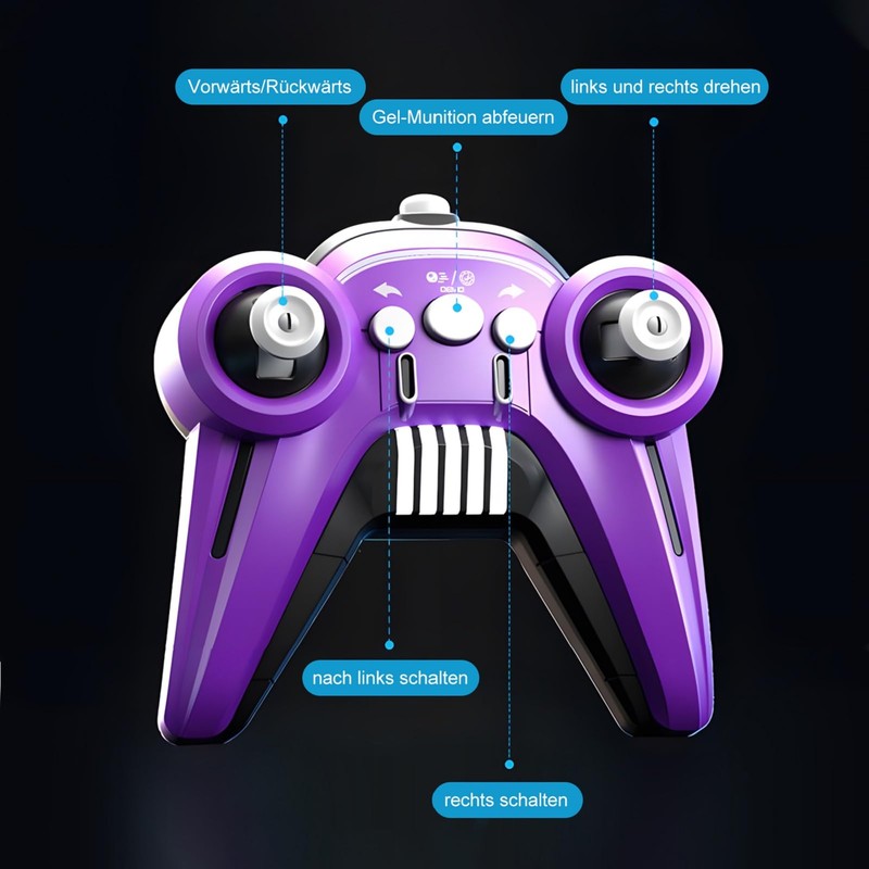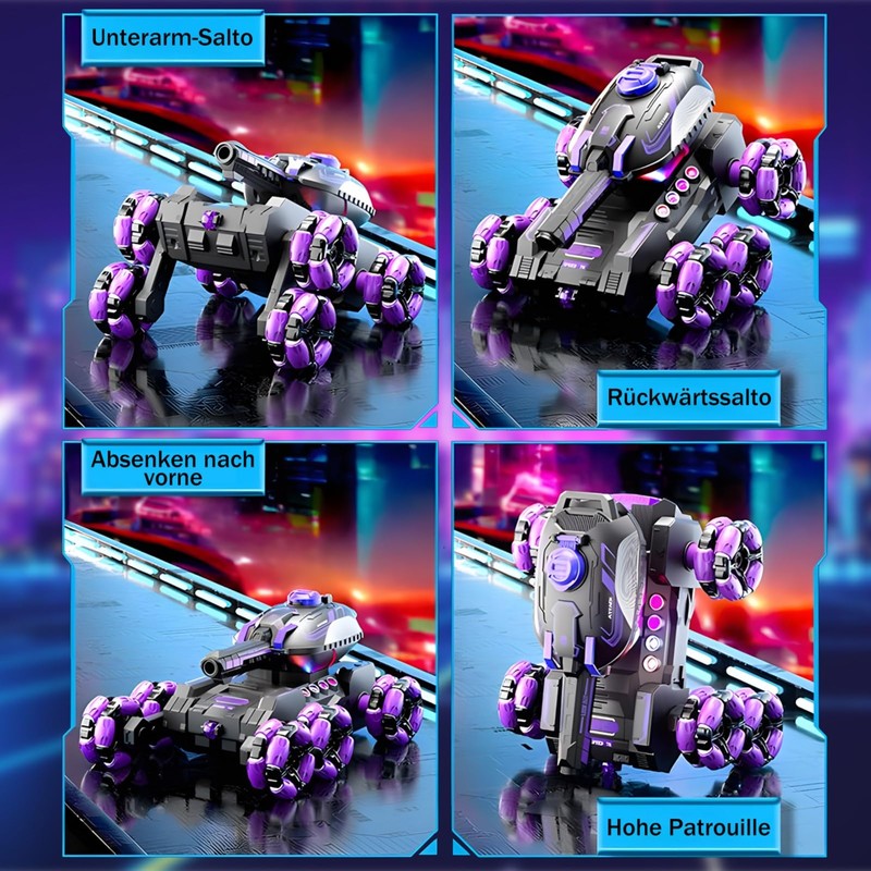 • 360° rotating RC stunt tank: This six-wheel tank is equipped with an automatically rotating arm to perform a variety of stunts. Children can control the RC tank so that it moves quickly forward and backward, supports parallel movements left and right, drifts, rotates 360° in any direction and much more. You can even control the tyres of the rotating arm to make all kinds of cool shapes, which offers endless possibilities for cool stunts, crazy flips and wonderful tricks.