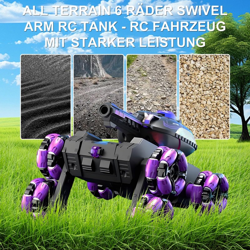 • All terrain 6 wheels swivel arm RC tank: the RC car is powerful and is suitable for all types of rough terrain such as sand, grass, dirt, snow, rocks and so on. With the remote control, the stunt car can be freely switched between on-road and off-road mode and can perform all kinds of crazy stunts, such as B. 360° swivel, double wheel drive, forearm/rear arm flap, high-stand patrol ride and mountaineering features that attract children's attention.