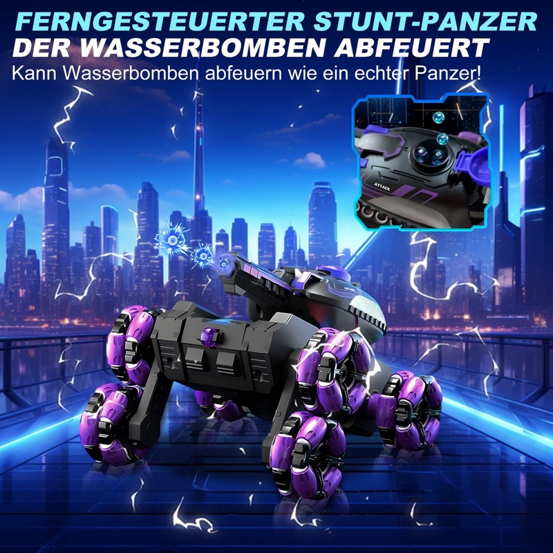 Contents of the set: toy tank x 1, remote control x 1, rechargeable battery x 1, AA battery x 2, screwdriver x 1, instruction manual x 1. The battery can be easily removed and charged. This remote controlled car not only brings children joy, but also stimulates children's hand-brain coordination, responsiveness and creative thinking. The RC stunt tank can spray water bombs like a real tank, giving children a more realistic tank toy car experience. The size of the six-wheel water bomb tank is 23.5 cm x 11 cm x 17 cm, and the transformable and expandable size is 58 cm x 24.5 cm x 70 cm. This remote controlled six wheel tank is an ideal birthday gift for 6-12 years old little boys and girls.