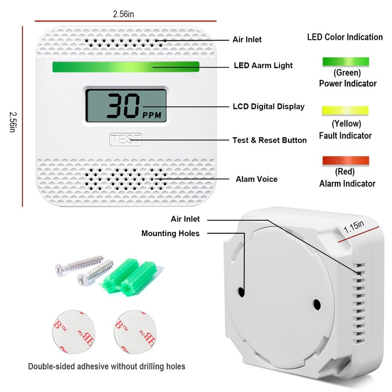 - User-Friendly-The LCD screen of this carbon monoxide alarm displays the carbon monoxide value prominently and intuitively.LED indicates status of the CO detector. Test-Hush Button makes testing the detector or silencing false alarms easy,even the elderly and children can operate it with ease.