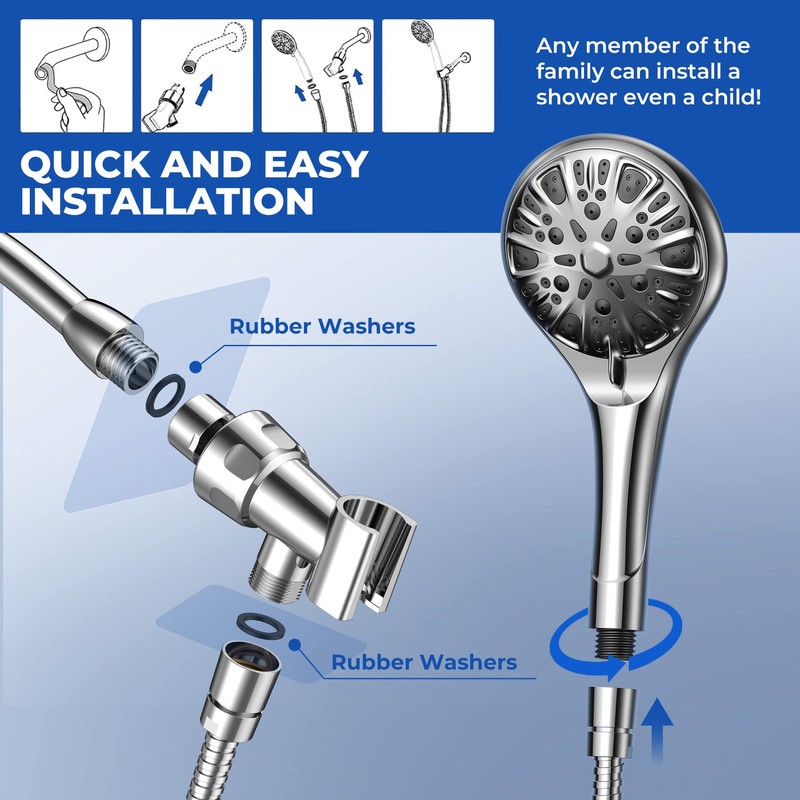 • Effortless Installation & Customer-Focused Support: No need for a plumber or special tools; Our shower head features universal G1/2 threaded connector that easily attaches to any standard shower arm in minutes; Simply follow the instructions in the user manual to guide you through the installation, which can easily be done on your own