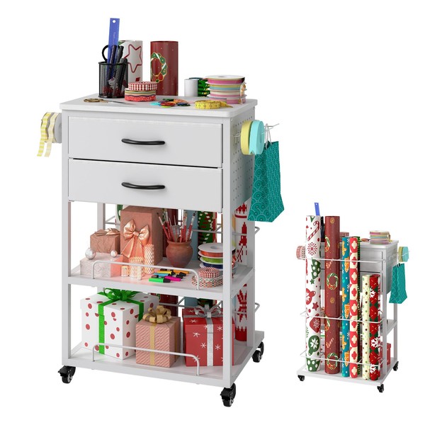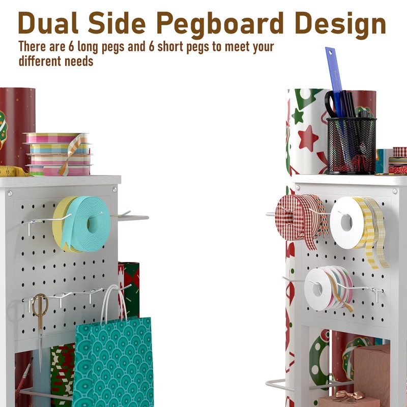 - Double Side Pegboards Design: The side of the wrapping paper storage cart is equipped with a total of 12 tool hooks, providing you with flexible options. You can hang ribbons or gi ft bags, or some sewing tools. The top is a flat desktop (20.4 * 11.8 inches), making it convenient for you to pack gi fts