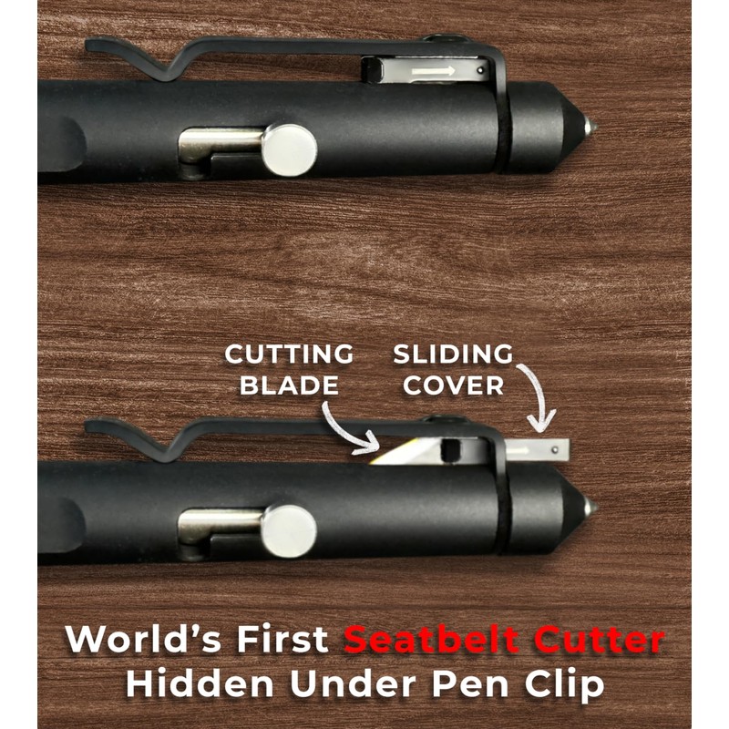 • WORLD’S FIRST SEATBELT CUTTER UNDER CLIP: Ingeniously hidden beneath the pen clip, this seatbelt cutter is designed for fast, one-handed use in emergencies. Simply slide the seatbelt under the clip, pull the pen, and quickly cut through to free yourself.