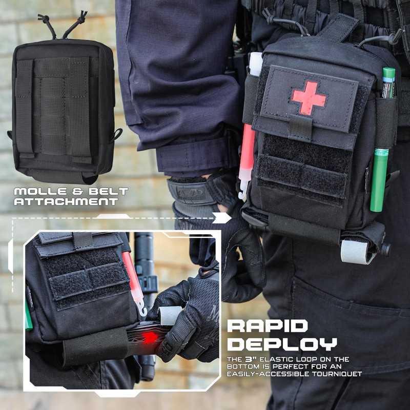 • STREAMLINING SUPPLIES FOR OUTINGS: With this Tactical Trauma Pouch, you may go hiking, camping, climbing, or other outdoor activities without worrying about a medical emergency. It is lightweight and compact, allowing you to put it in various places(home/car/workplace) for immediate retrieval.