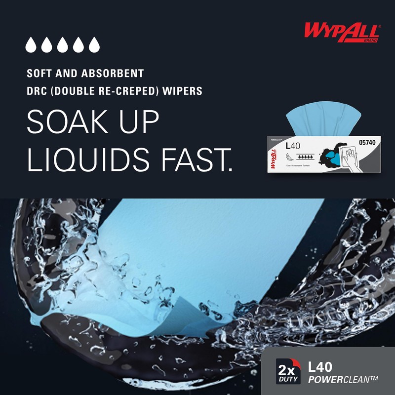 - Each WypAll Power Clean L40 Extra Absorbent Towels measures 16.4" x 9.8"; Pop-Up Box is designed for easy, one-at-a-time dispensing