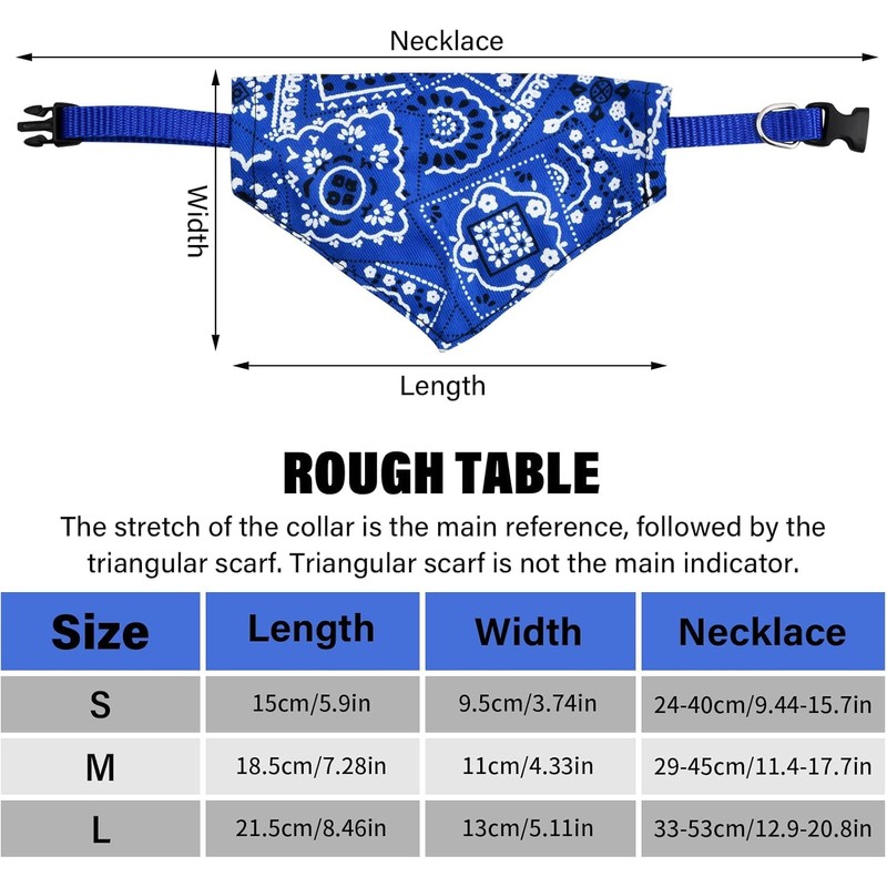 - 【El paquete incluye】Viene con 4 pañuelos para perros en diferentes colores, rojo, azul, negro, rosa, ofrecemos tres tamaños para que elijas: S/M/L; S: circunferencia del cuello de la mascota aprox. 24-40 cm de longitud; METRO: 29-45 cm de longitud; L: 33-53 cm de largo, suficiente para repuesto y reemplazo para sus mascotas.
