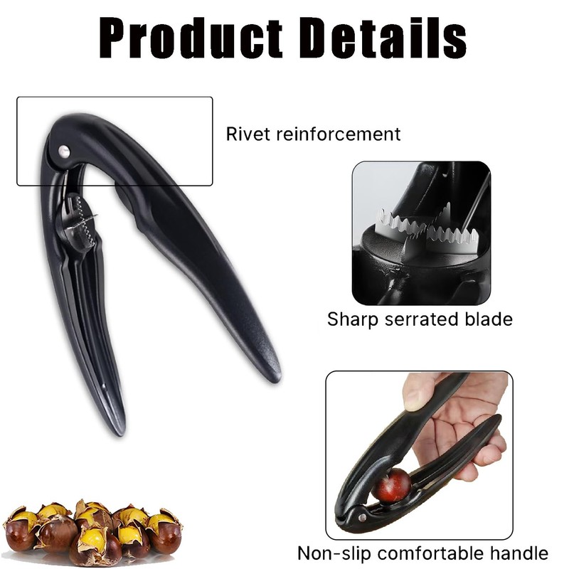- 【Multi-Purpose Nut Cracker for All Tough Shells】: Multi-Purpose Nut Cracker for All Tough Shells Beyond chestnuts, this versatile nutcracker handles walnuts, hazelnuts, and dried fruits with ease. A must-have kitchen accessory for baking, camping, or holiday cooking!