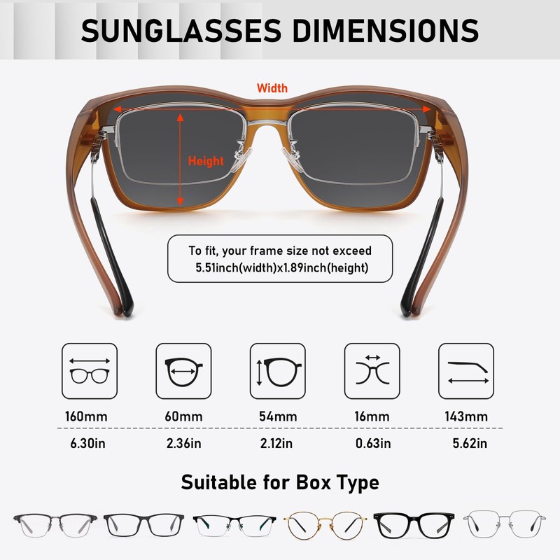 Ensure a perfect fit by measuring the width and height of your prescription frames. Our sunglasses are designed to accommodate frames with widths and heights slightly smaller than 5.51 inches and 1.89 inches, respectively.