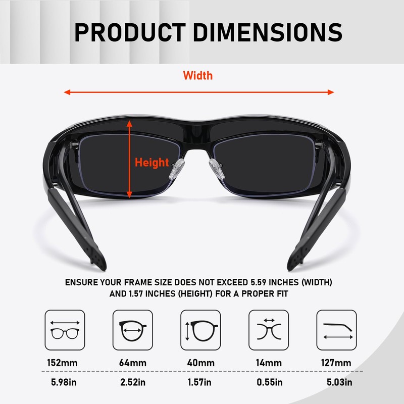 Specifically designed to fit over prescription glasses, our sunglasses accommodate frames up to 5.59 inches in width and 1.57 inches in height. The ergonomic wrap-around design ensures a comfortable fit, with oversized shades offering extensive coverage to protect your eyes from irreversible UV damage. Side lenses enhance peripheral vision and provide additional glare protection, making these sunglasses perfect for driving and other outdoor activities.