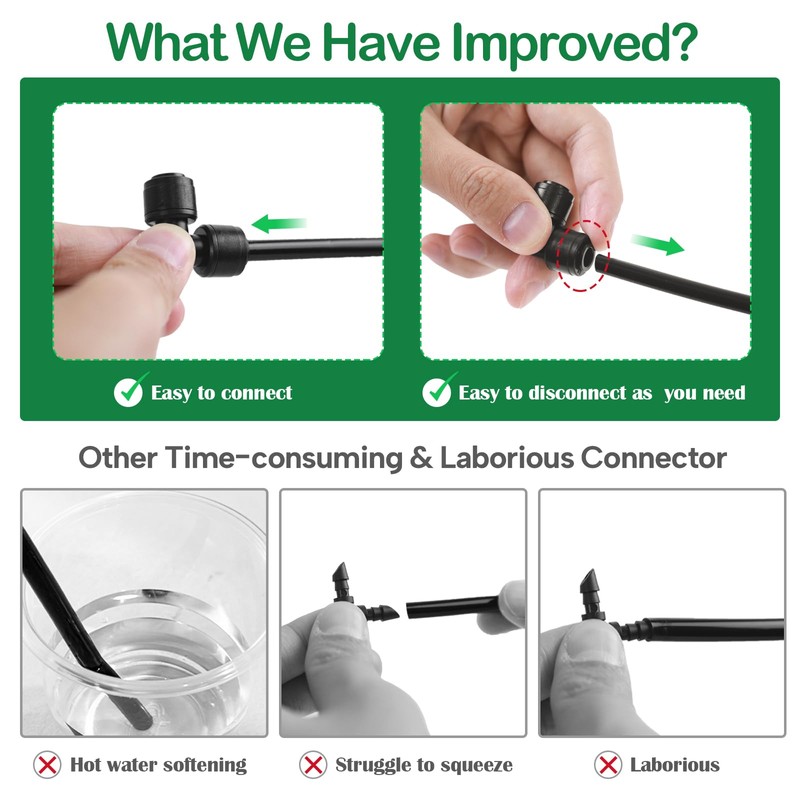 - Upgraded Quick Connect Design: Featuring an innovative push-to-fit design, our 1/4" dripline elbow fittings allow for quick, secure, and leak-free connections in seconds—no tools or hot water required! Say goodbye to the hassle of traditional barbed connectors. Plus, they include a one-touch pull-out feature for easy installation, removal, and repositioning of your tubing