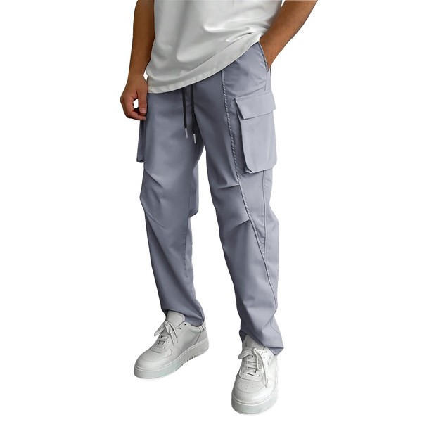 WZIKAI Men's Casual Cargo Pants Elastic Waist Drawstring Joggers Pants Athletic Techwear Jogging Sweatpants with Pockets Grey L
