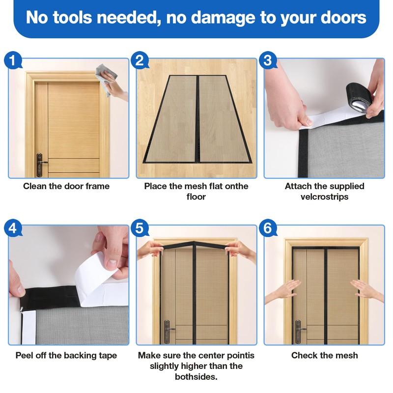 - Easy installation without tools: no screws or hammer required. Simply attach the self-adhesive Velcro tape to the door frame - done. Removable, foldable and washable.