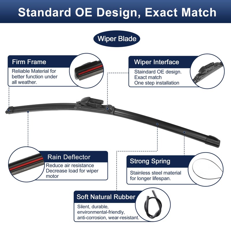 - [Long-lasting Performance] Made of durable rubber and plastic for longer lifespan. The upgraded red layer reinforces the compactness so the wiper won't shake a lot. With good resistance to high/low temperature, tear and friction. The aerodynamic deflector enables stable performance even at high speed.