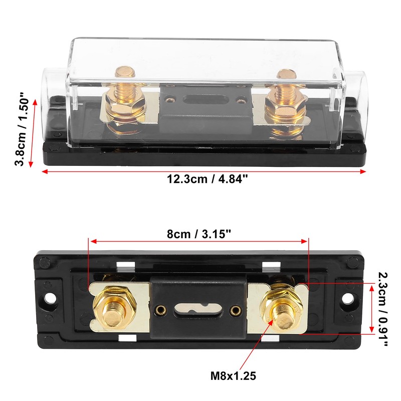 - Securely holds fuse and terminals (Can be used with 0, 4, 8, 10 Gauge Ring Terminals).