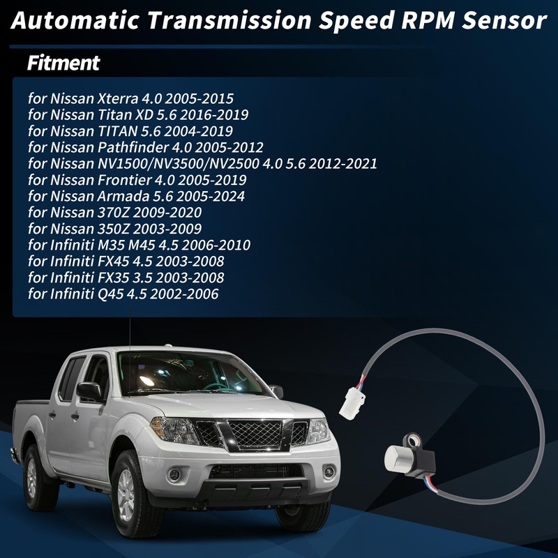 - Fitment: This Vehicle Transmission Speed Sensor for Nissan Xterra 4.0 05-15 for Nissan Titan XD 5.6 16-19 for Nissan TITAN 5.6 04-19 for Nissan Pathfinder 4.0 05-12 for Nissan NV1500/NV3500/NV2500 4.0 5.6 12-21 for Nissan Frontier 4.0 05-19 for Nissan Armada 5.6 05-24 for Nissan 370Z 09-20 for Nissan 350Z 03-09 for Infiniti M35 M45 4.5 06-10 for Infiniti FX45 03-08 for Infiniti FX35 03-08 for Infiniti Q45 02-06, OE Number:2VSS0086/3093597X00/319351XJ0A/319351XJ0B/319351XJ0C/319351XJ0D/3193597X00