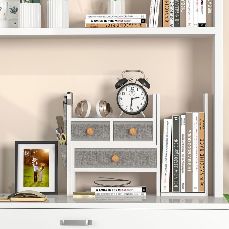 **Feature:** * Keep your rooms neat organized with 3-drawers design * Large storage capacity with expandable & adjustable length * Multifunctional Desktop Bookshelf with various placement methods * Eco-friendly material for a healthy life style *Space-saving-Effective use of space