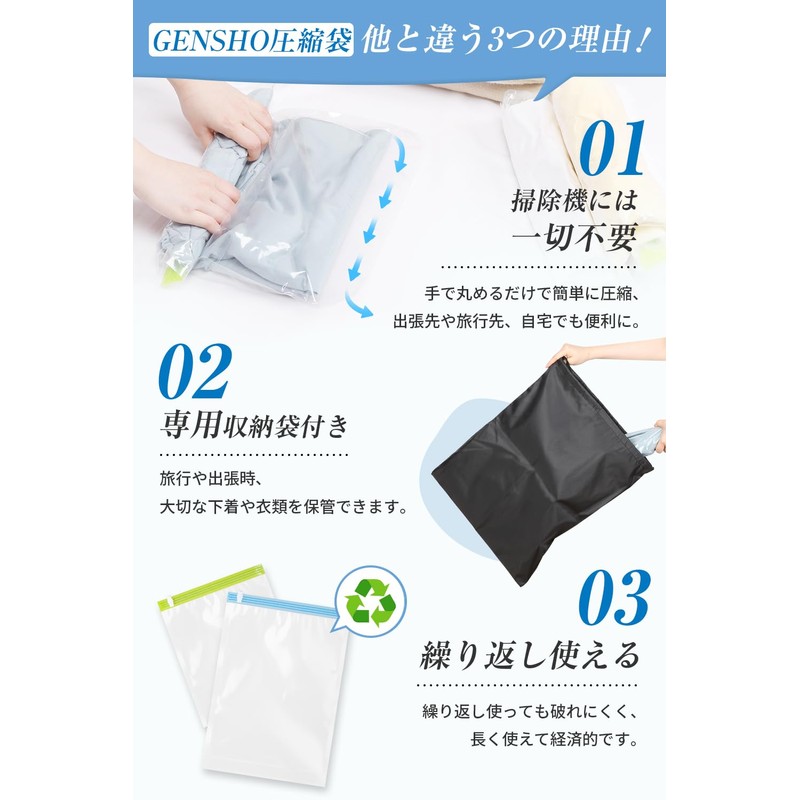 【銀イオンで抗菌・防臭×厚手素材で丈夫・長持ち】原初(Gensho) 圧縮袋 旅行用衣類圧縮袋 圧縮パワーくん 【3重チャック密封力UP】 手巻き式 現役...