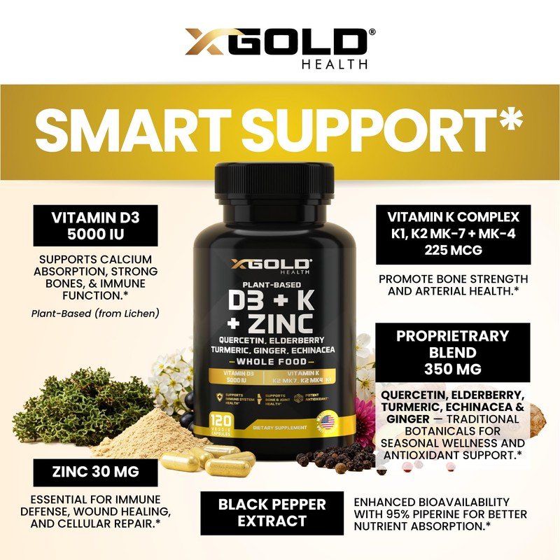 - INVIGORATE YOUR IMMUNE SYSTEM: Revitalize your immune system with the Plant-Based Vitamin D (D3 from Lichen), Vitamin K (K2 MK7, K2 MK4, K1), Zinc, Quercetin, Elderberry, Turmeric, Ginger & Echinacea Daily Supplement from X Gold Health! Because happiness starts with good health, we've created this comprehensive one-a-day supplement to efficiently provide your body with what it needs to run at peak performance without a hitch!