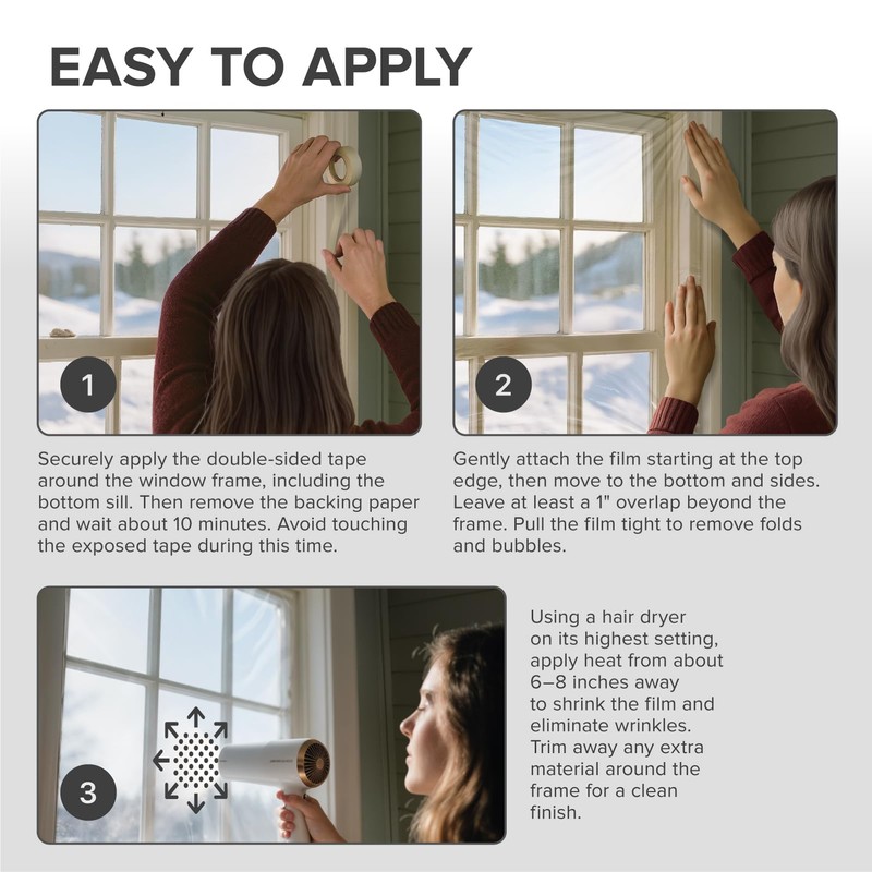 - ✌️ Easy-to-Install - Apply the tape, attach the thermal window cover for winter, and use a hairdryer to shrink-tighten it in minutes. Strong adhesive ensures long-lasting hold. Please read the instructions for the best experience!