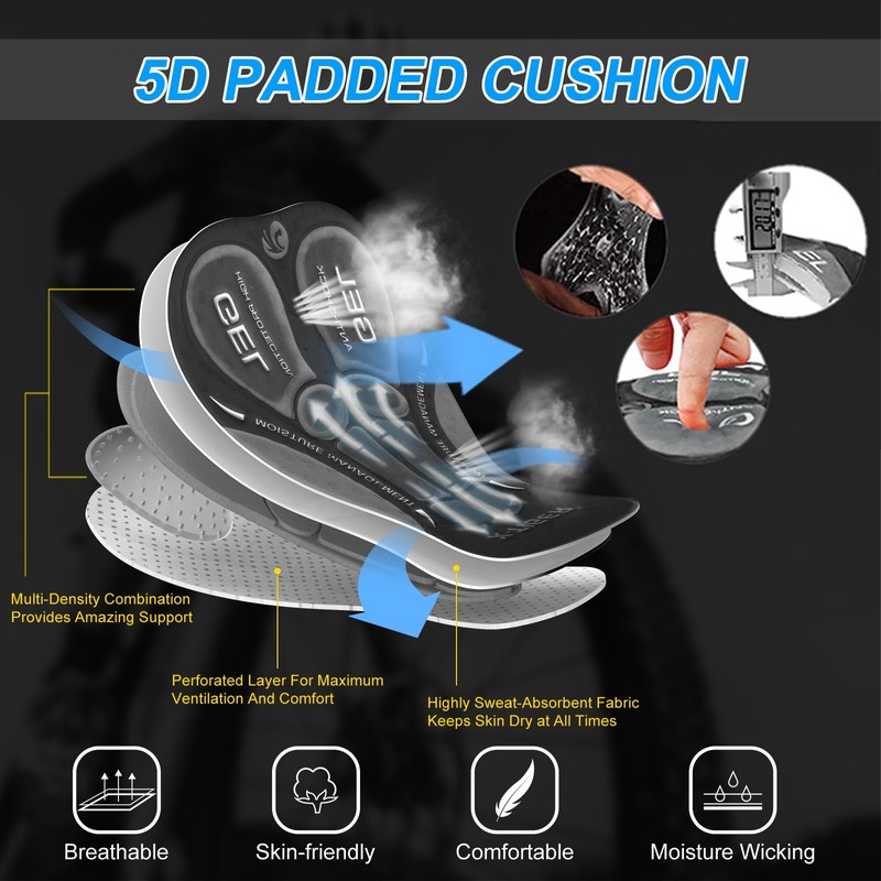 - 5D Padded: Mens cycling underwear comes with 5D gel padding that effectively dampens shock and reduces pressure and pain in the buttocks. Ergonomic fit, soft and comfortable for your long rides.