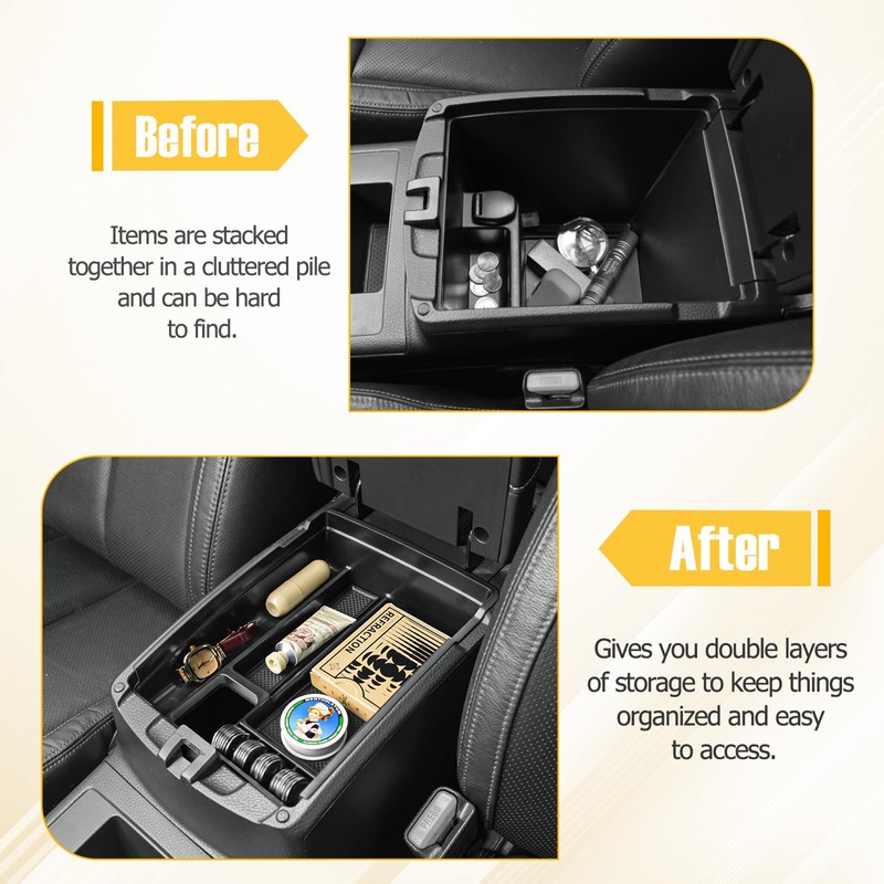 • Easy Installation -- The tray is easy to install with no tools or modifications required. And it's easy to grab and remove too. Each compartment comes with rubber mats to minimize item rattling and noise.