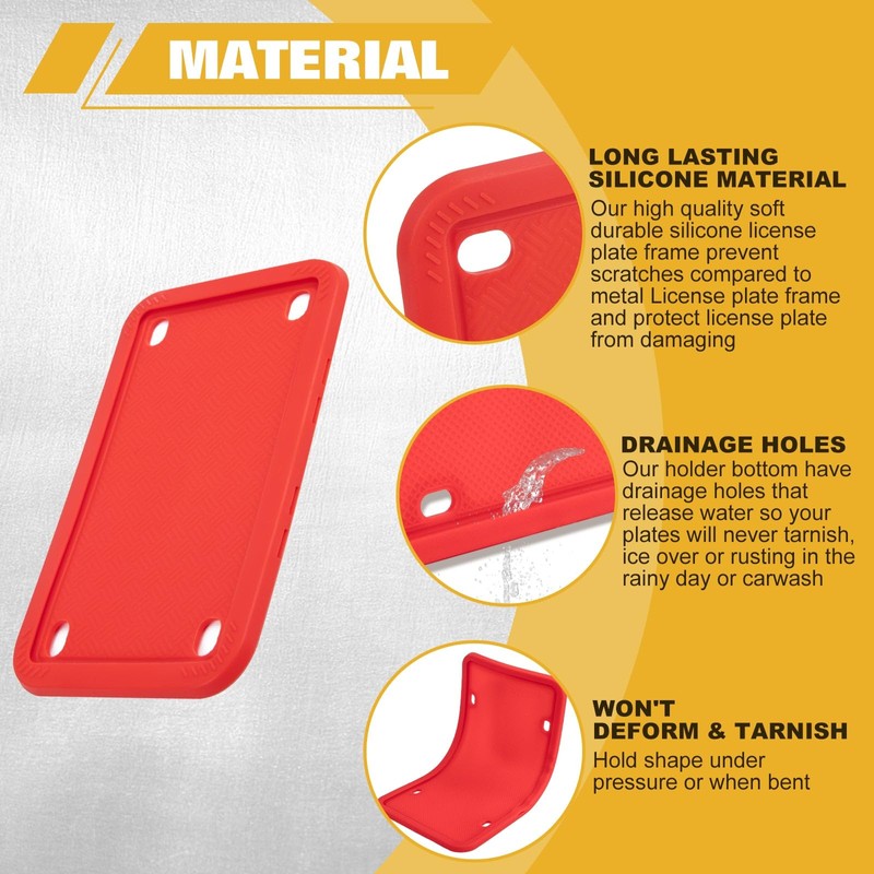 - Long Lasting Silicone material: Our high quality soft durable silicone license plate frame prevent scratches compared to metal License plate frame and protect license plate from damaging. Our holder bottom have drainage holes that release water so your plates will never tarnish, ice over or rusting in the rainy day. Hold shape under pressure or when bent