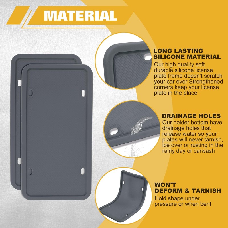 - Long Lasting Silicone material: Plastic and metal license plate holders vibrate every time you're on the road. This make them bang against your bumper, scratching and denting paint and exposing your car to rust. Our high quality soft durable silicone license plate frame doesn't scratch your car ever. Our holder bottom have drainage holes that release water so your plates will never tarnish, ice over or rusting in the rainy day or carwash. Hold shape under pressure or when bent