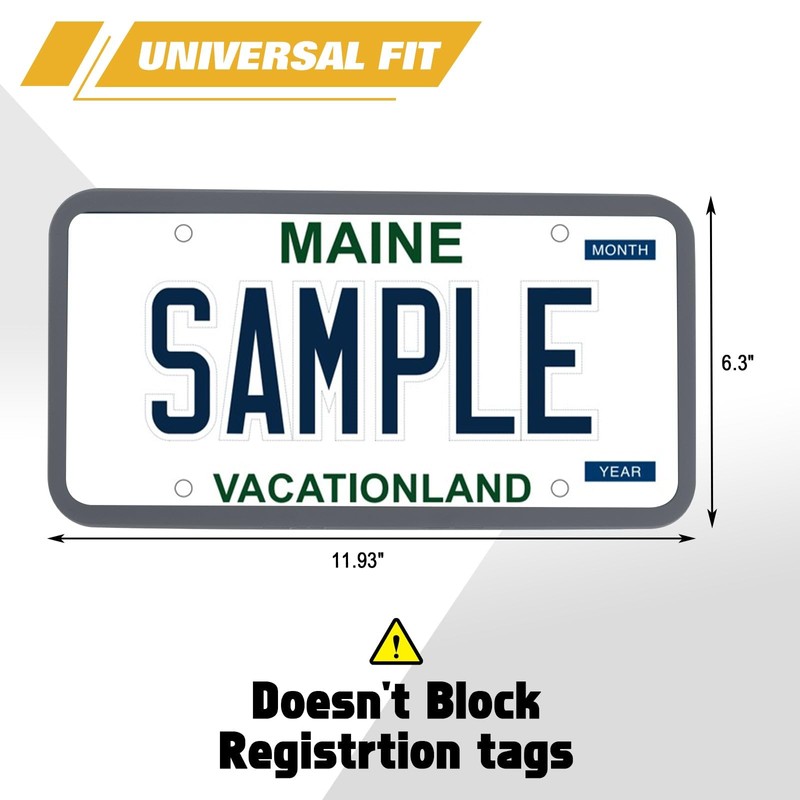 - Universal Fit: 2 Packs of silicone license plate frame perfectly fits all standard-issue license plates(Size:11.93" x 6.3"). Please measure your licence plate size before purchase! Elegant design makes your car highly attractive. Package include: 2x license plate frame, 8x screw caps, 8x cup washers, 8x stainless screws, 4x screw inserts