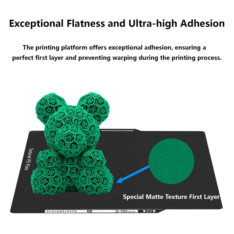- Special Bottom: Texture PEI Plate offers a one-of-a-kind first-layer surface. Through the application of a powder-coating process, this PEI Build Plate creates a rugged texture that adds a texture to your prints.