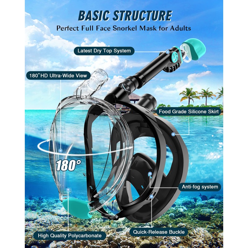 - Latest Dry Top Breathing System: The snorkeling masks adults full face has 3 completely separate air channels, by inhaling fresh air from the middle and exhaling exhaust air from the sides, you can breathe freely and comfortably through your nose, just like on land, Give you a Happily & Safe snorkeling experience.