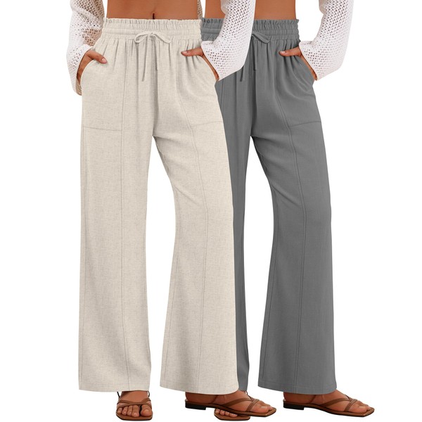 Xaatren 2 Pack Women's Linen Pants Summer Wide Leg Drawstring Elastic Waist Pant Casual Loose Fit Beach Trousers with Pockets(Flaxen, Gray,Medium)