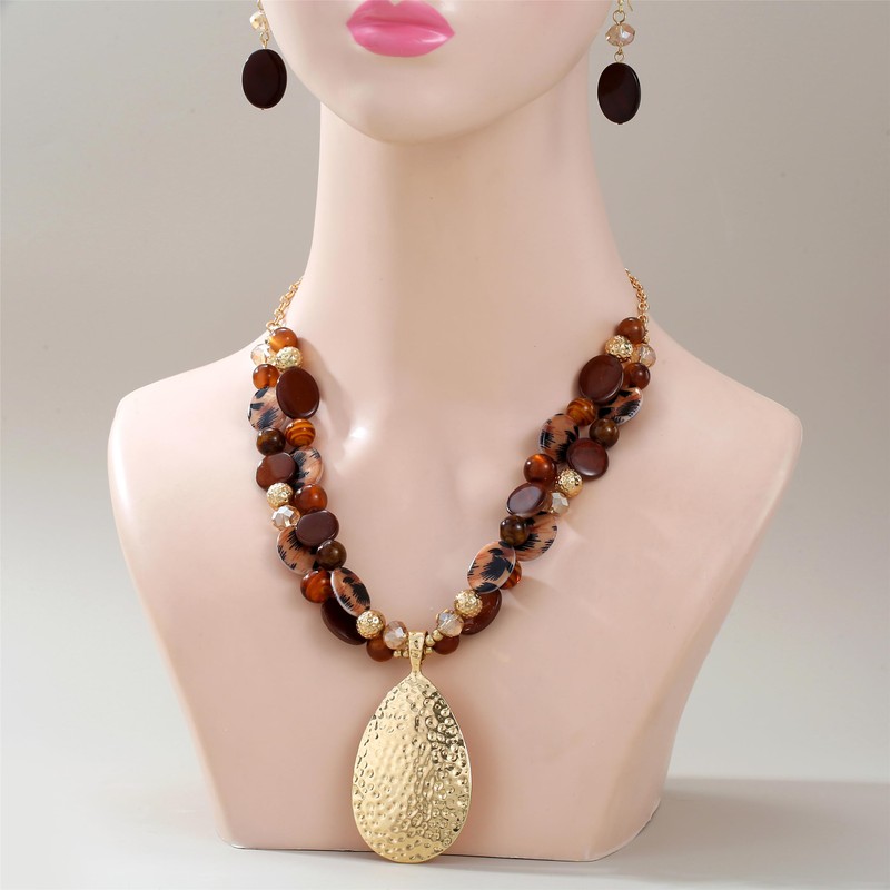 Xalroco 20‘’+3‘’ Gold Teardrop Pendant Statement Necklace for women Trendy Brown Crystal Shell Beaded Gemstone Necklaces and Earrings Set Jewelry Gifts (Brown+Lepard Print)