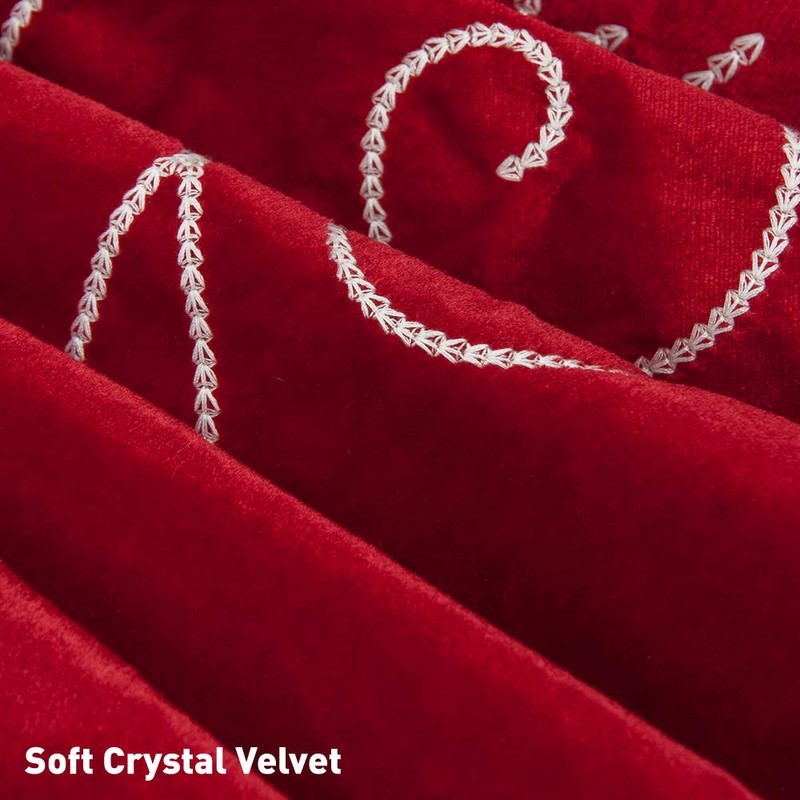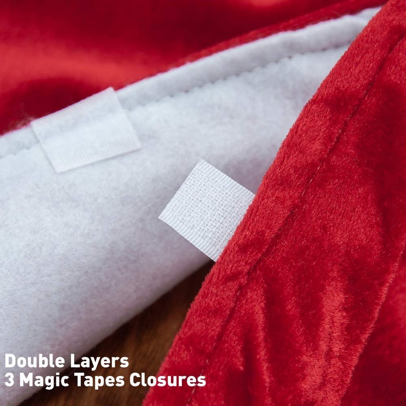 - It made with red crystal velvet for a proper look and feel. Three magic tapes closures round this piece out with a handy touch for keeping your tree wrapped up.