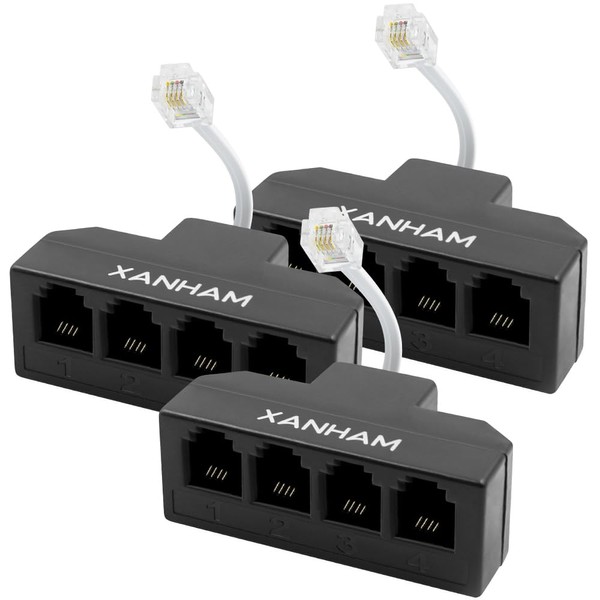 XANHAM RJ11 Cable 4 Way Splitter(3 Pack) 6P4C Connector Phone Line Cord Adapter with 3 inch Cable for Landline Telephone Wire, Black, AV01404