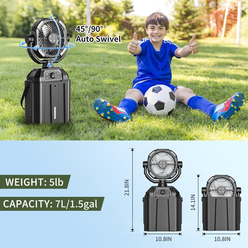 Portable Misting Fan Rechargeable for Hot Weather - 9-inch Auto Swivel Camping Fan with 25000mAh USB Battery as Power Bank, Outdoor fan with 4 Mist Cooler, 7L Bucket for Patio,Fishing,Yard,Beach,Golf