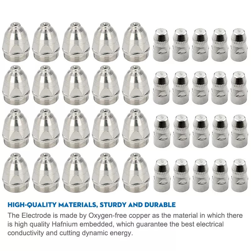 Nominal welding current: 80-100A Max Cutting thickness: 40mm This consumer suit for 80A using. Package Includes: 20pc Set x 10 1.5mm Tips + 20 Electrodes fits P80 Plasma Torches - Our electrodes use the correct Halfnium Insert |